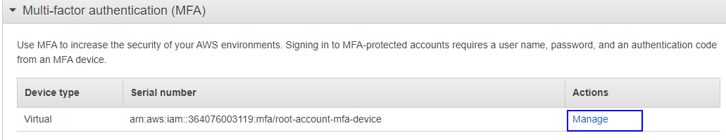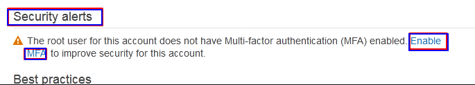 Note: to manage MFA devices for the root AWS account, you must use your root account credentials to sign in to AWS. You cannot manage MFA devices for the root account using other credentials. - In the Identity and Access Management under security alerts click on “Enable MFA”