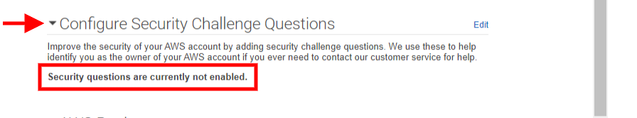 The AWS support portal allows account owners to establish security questions that can be used to authenticate individuals calling AWS customer service for support. It is recommended that security questions be established.