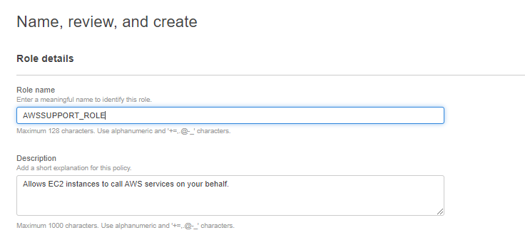 aws iam create-role --role-name <aws_support_iam_role_name> --assume-role-policy-document file://tmp/TrustPolicy.jsonStep 4: Attach the AWSSupportAccess policy to the newly created IAM support role.