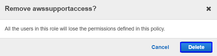 - Click on the remove button or cross button to remove the AWSSupportAccess policy from your role.