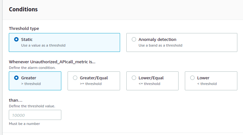 In the conditions section select the Threshold type to Static, Define the alarm condition with a Greater(>) threshold and give the value of threshold as you defined in metric value then click on the Next button