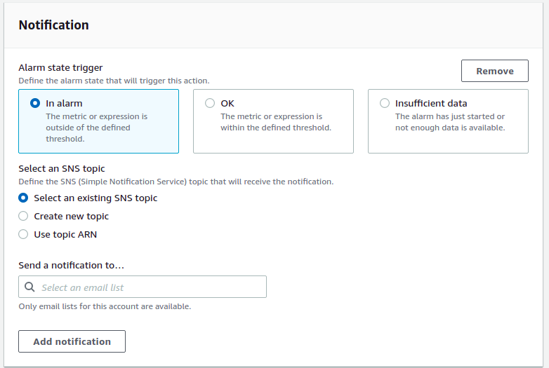 Next is Configure actions in this choose Alarm state trigger option as In alarm, For SNS topic select SNS if exist or can create a new topic, click on NEXT