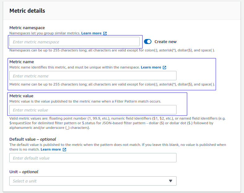 Under the Metric Details section, provide the details required like Metric namespace, Metric name, metric value, and Default value(optional), and then click on the Next button