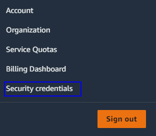 - On the right side of the navigation bar, choose on your account name, and then choose Security Credentials.