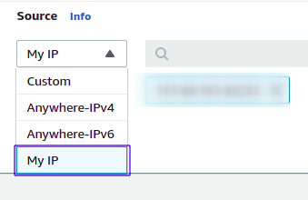 Select My IP to allow inbound traffic only from your machine (i.e, from your IP address only).
