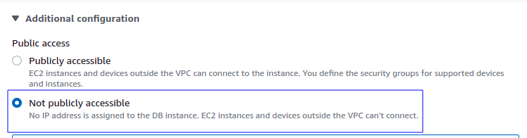 Click on Additional configuration and choose Not publicly accessible under Publicly Access to disable the flag and restrict public access.