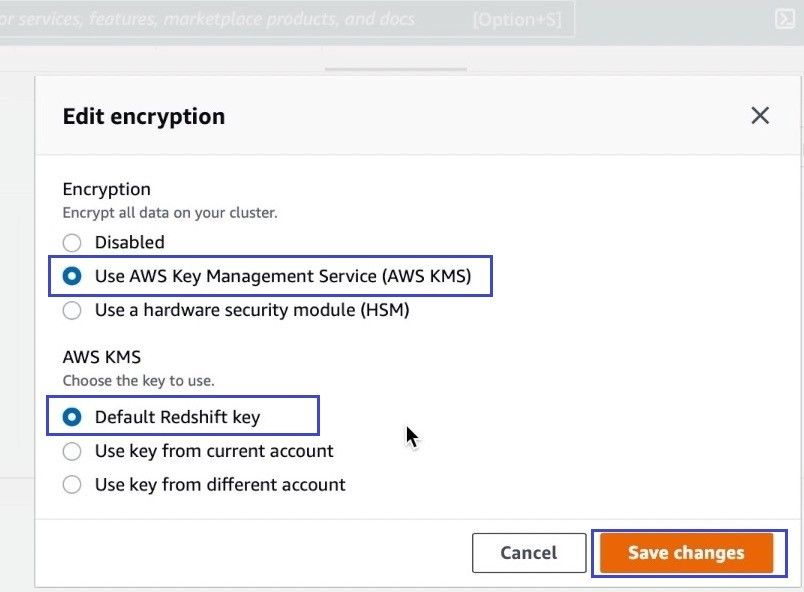> aws redshift modify-cluster --cluster-identifier <value> --encrypted --kms-key-id <value>