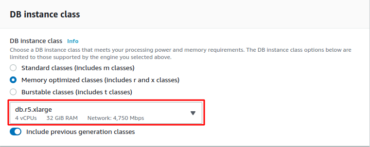 - Choose db.r5 instance class type from the range of options