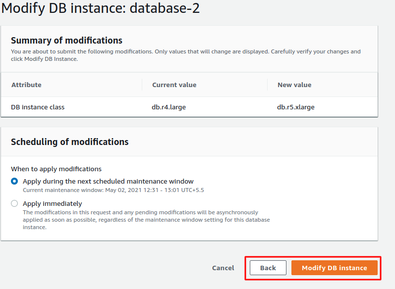 - once done with the review and scheduling click on Modify DB instance to apply changes or if you notice any mistake click on Back to go to the previous window