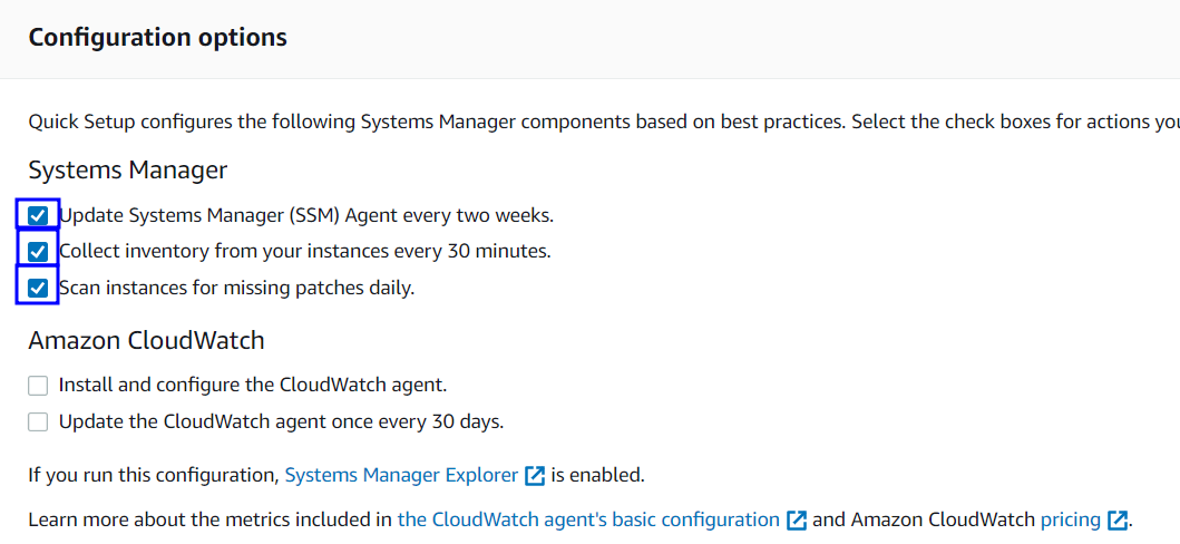 For Configuration options, ensure that the following options are selected under Systems Manager. Quick Setup configures these components based on best practices: