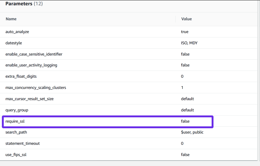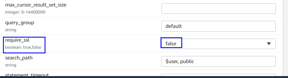 Step 5: In the default parameter group SSL require set value is false it is not editable for examination click on the default parameter group