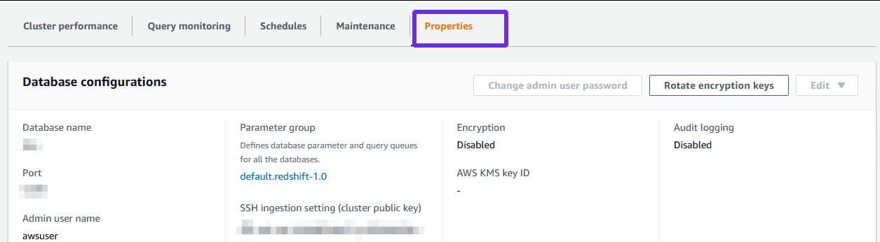 Step 4: In properties, tab see in Data configurations it contains Parameter group and encryption we can see encryption either enable or disable
