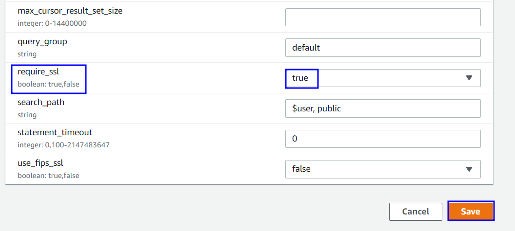 in the parameter group you change the false value of require_ssl in true steps to change the value of the parameter group not in the default group we assume that you already created the parameter group