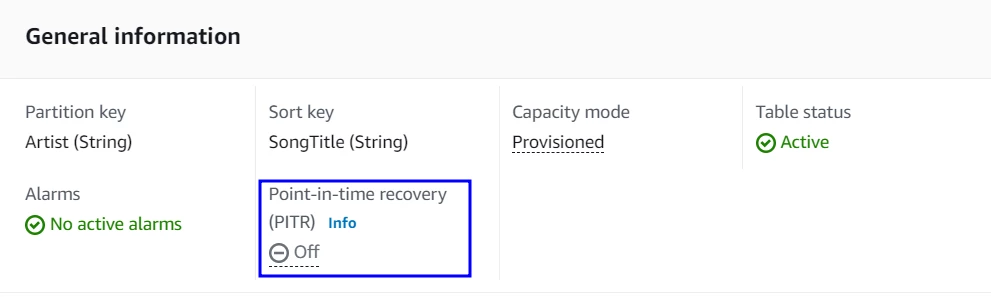- In the overview tab under the Table details, check the Point-in-time recovery column