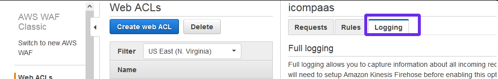 Before enable logging you create the Amazon Kinesis Data Firehose using a name starting with the prefix “aws-waf-logs-” it created in the US East ( N. Virginia) region.