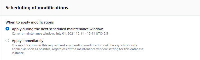 Select Apply during the next scheduled maintenance window to apply the changes automatically during the next scheduled maintenance window.
