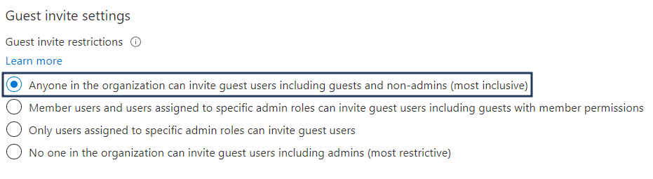 The following command assigns the Guest Inviter role to a user without assigning them a global administrator or other admin roles. Then make sure you set Admins and users in the guest inviter role can invite is chosen.