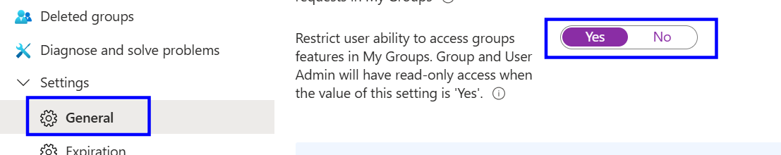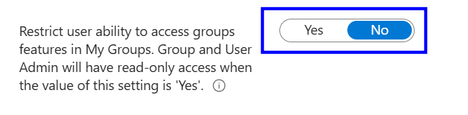 This setting in Microsoft Entra ID (Azure AD) controls whether non-admin users can access and manage group-related features through the Access Pane (My Apps portal). Setting it to Yes restricts ordinary users from creating or modifying groups, which helps enforce centralized control over identity and access management.