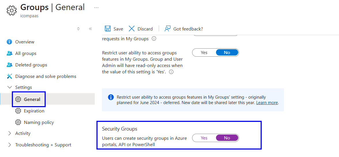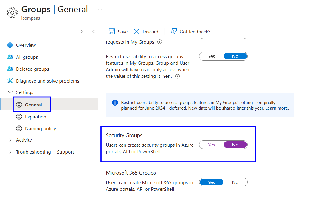 By default, Microsoft Entra ID allows users to create security groups. The setting must be changed to No if you want to restrict this.