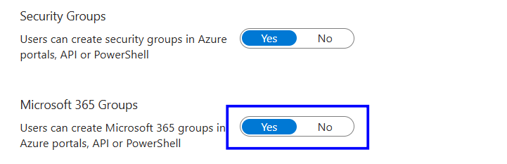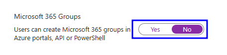 This setting controls whether regular users can create Microsoft 365 groups. When it is set to No, only administrators can create these groups. This prevents users from creating unnecessary or unauthorized Microsoft 365 groups and helps maintain better control over group creation in the organization.