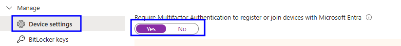 By default, this setting is not always turned on. Administrators must manually set it to Yes if they want to require MFA for device registration or joining.