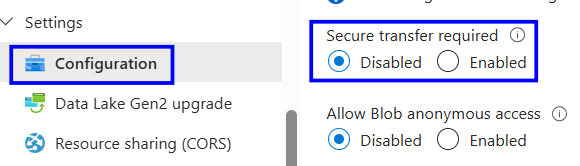 In the Configuration page, enable the ‘Secure transfer required’ option.