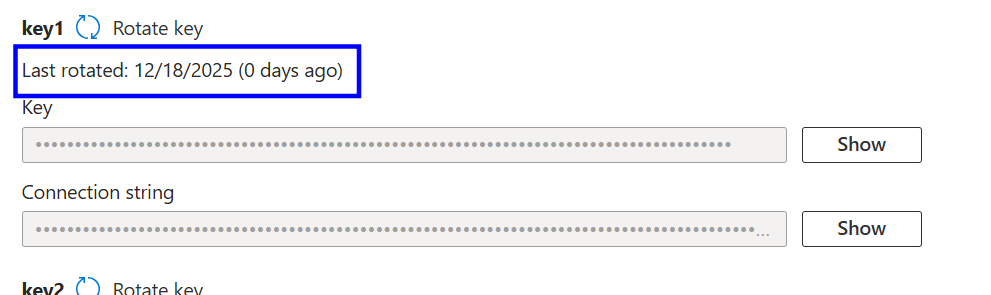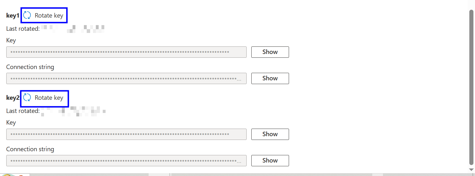 You will see key1 and key2. To rotate a key, click Rotate key.