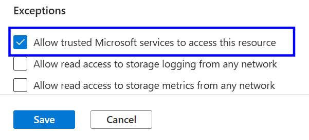 When network restrictions are configured on an Azure Storage Account, trusted Microsoft services are not allowed by default.