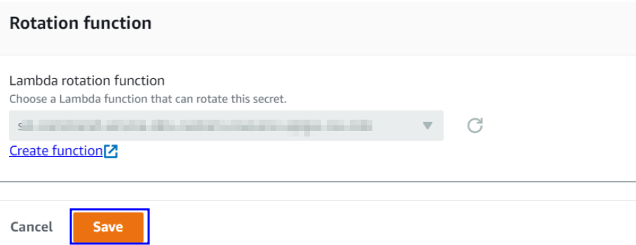 For Choose an AWS Lambda function, choose your rotation function from the drop-down list. Else, create one. Return and perform this step when the function is created and ready to associate with your secret and click Save.