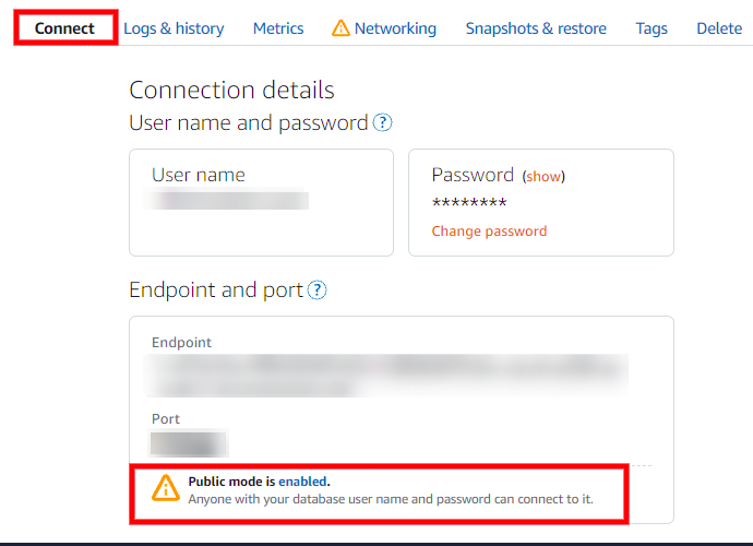 Under Connect section, scroll to Endpoint and port to view the warning that displays the public mode status.