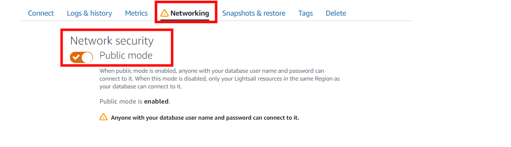 When public mode is enabled, anyone with your database user name and password can connect to it. Therefore it is recommended to Disable public access on the Amazon Lightsail RDS.