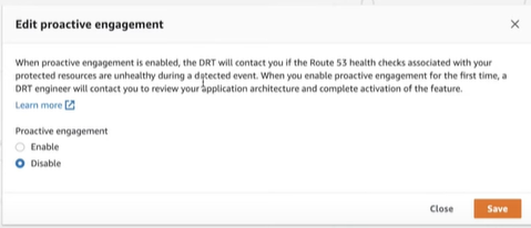 Click Proactive engagement to enable advanced DDoS protection for the specified AWS resource.