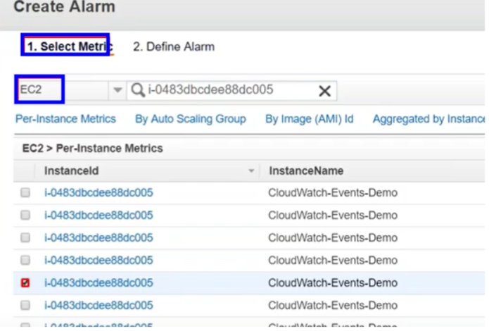 - In the Metric Name column, verify each alarm available for the EC2instance metric parameter name. If the EC2 instance metric is not used by any of your existing alarms, the configuration changes made to your EC2 are not monitored using Amazon Cloud Watch