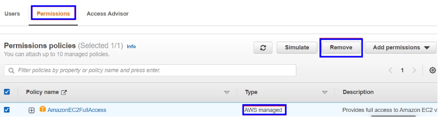 Step 06:In the Managed Policies section, choose Detach Policy next to the Administrator Access managed policy to detach it from the selected Amazon IAM group.