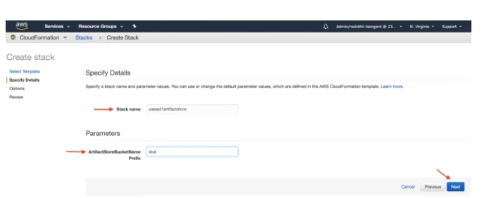 In Stack name, enter a name for the stack (for example, artifact store).