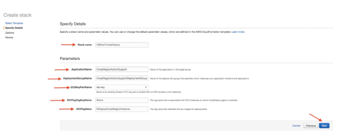 To run Amazon EC2 and AWS Code Deploy instances, you can use AWS Cloud Formation templates prepared by AWS, In the AWS console, on the Specify Details page, do the following: