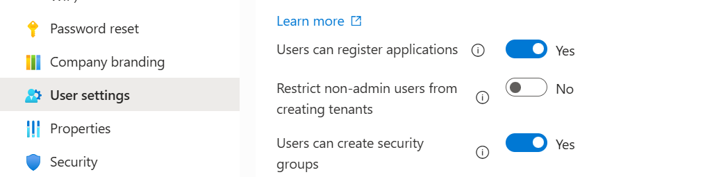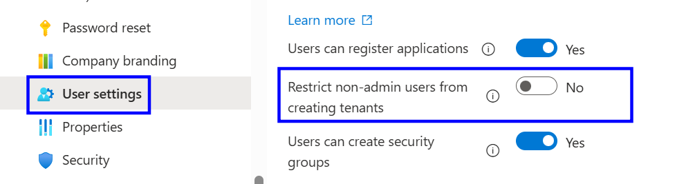 Default: Yes, Non-admin users are allowed to create Azure AD tenants