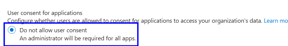 By default, Microsoft Entra ID allows limited user consent for applications unless modified. This setting must be manually updated to “Do not allow user consent” to fully restrict end-user authorization.