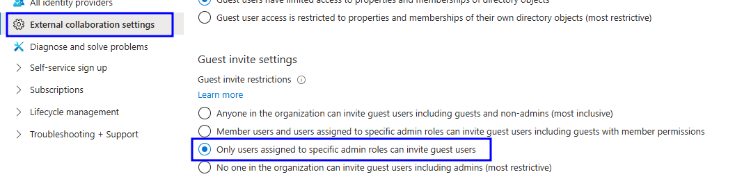 Verify that the selected option is ‘Only users assigned to specific admin roles can invite guest users’.