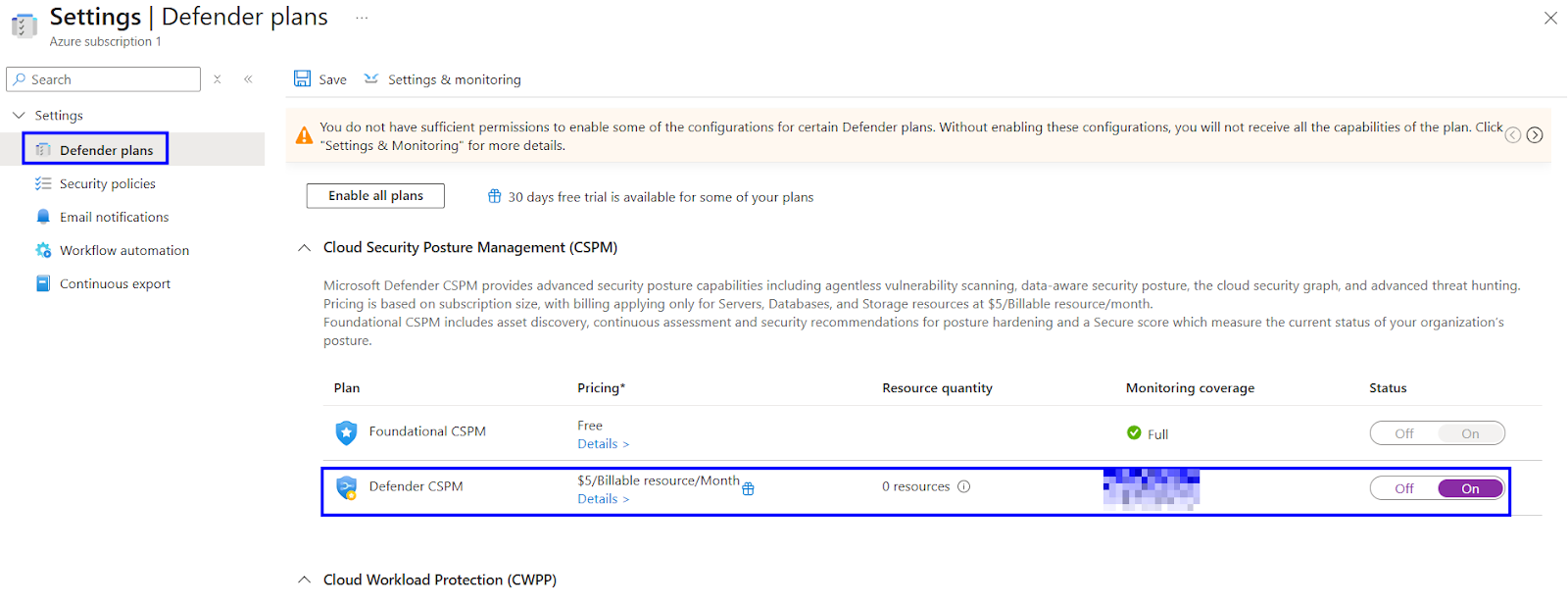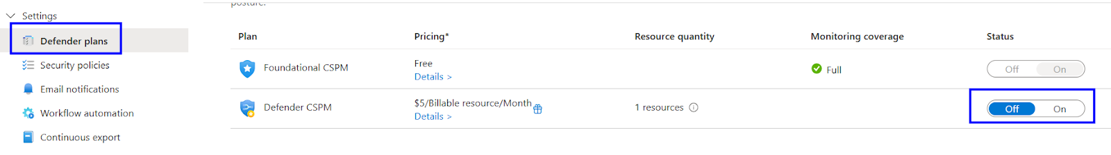Under Cloud Security Posture Management (CSPM), turn ON the Defender CSPM.