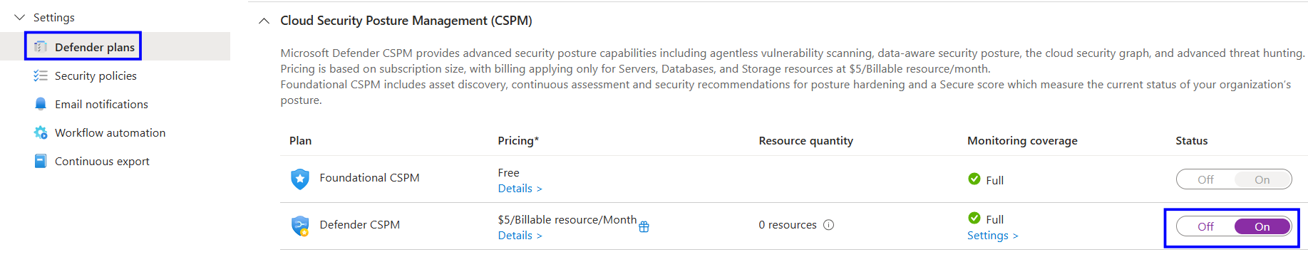 Verify that Defender CSPM is enabled under Cloud Security Posture Management (CSPM).