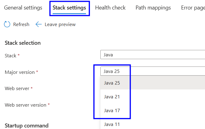 Under Stack settings, in stack selection, confirm the stack is set to Java.