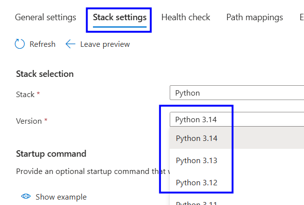 Under Stack settings, in stack selection, confirm that the Stack is set to Python.