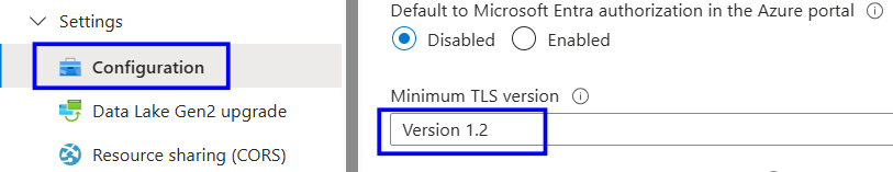 In the portal, search for the same Storage account, and under Settings, open Configuration.