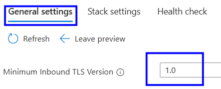 In the General settings tab, locate the Minimum TLS Version setting and change it to 1.2.”