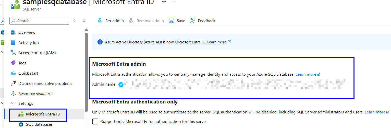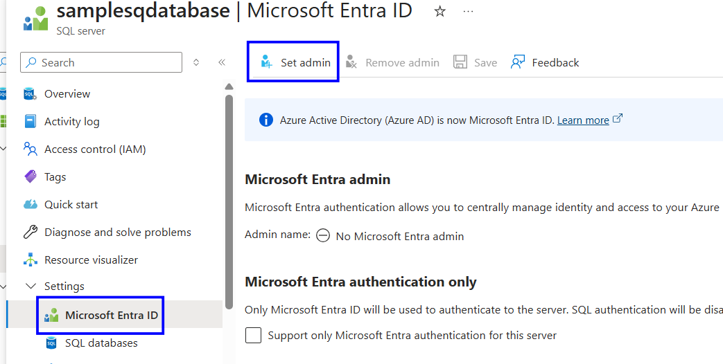 Under Settings, select Microsoft Entra ID. Click Set admin.