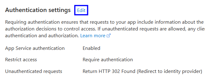 If we already have Identity Providers, we can see the edit option beside the Authentication settings in that section, and enable the app service authentication.