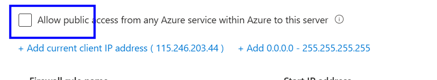 In the Networking section, we need to uncheck 'Allow public access from any Azure service within Azure to this server.'