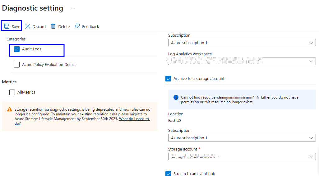Select a destination such as a Storage Account, a Log Analytics Workspace, or an Event Hub