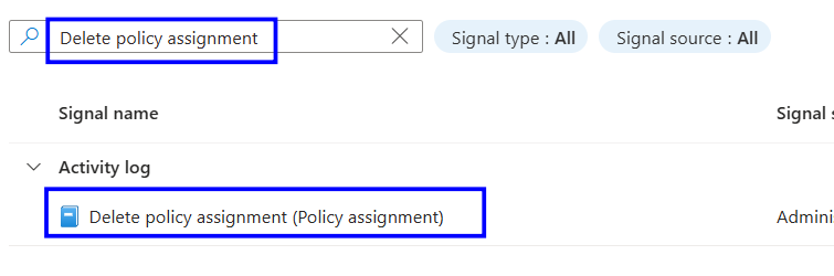Under Condition, click See all signals, search for Operation name "Delete policy assignment", and select the signal.